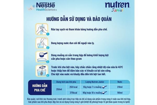 Pha sữa đúng cách đóng vai trò thiết yếu để Nutren Junior phát huy tối đa lợi ích dinh dưỡng. Hãy tuân thủ các hướng dẫn về tỷ lệ pha, nhiệt độ nước và thời gian sử dụng nhằm đảm bảo khả năng hấp thụ tốt nhất, giảm thiểu các vấn đề tiêu hóa cho bé.
