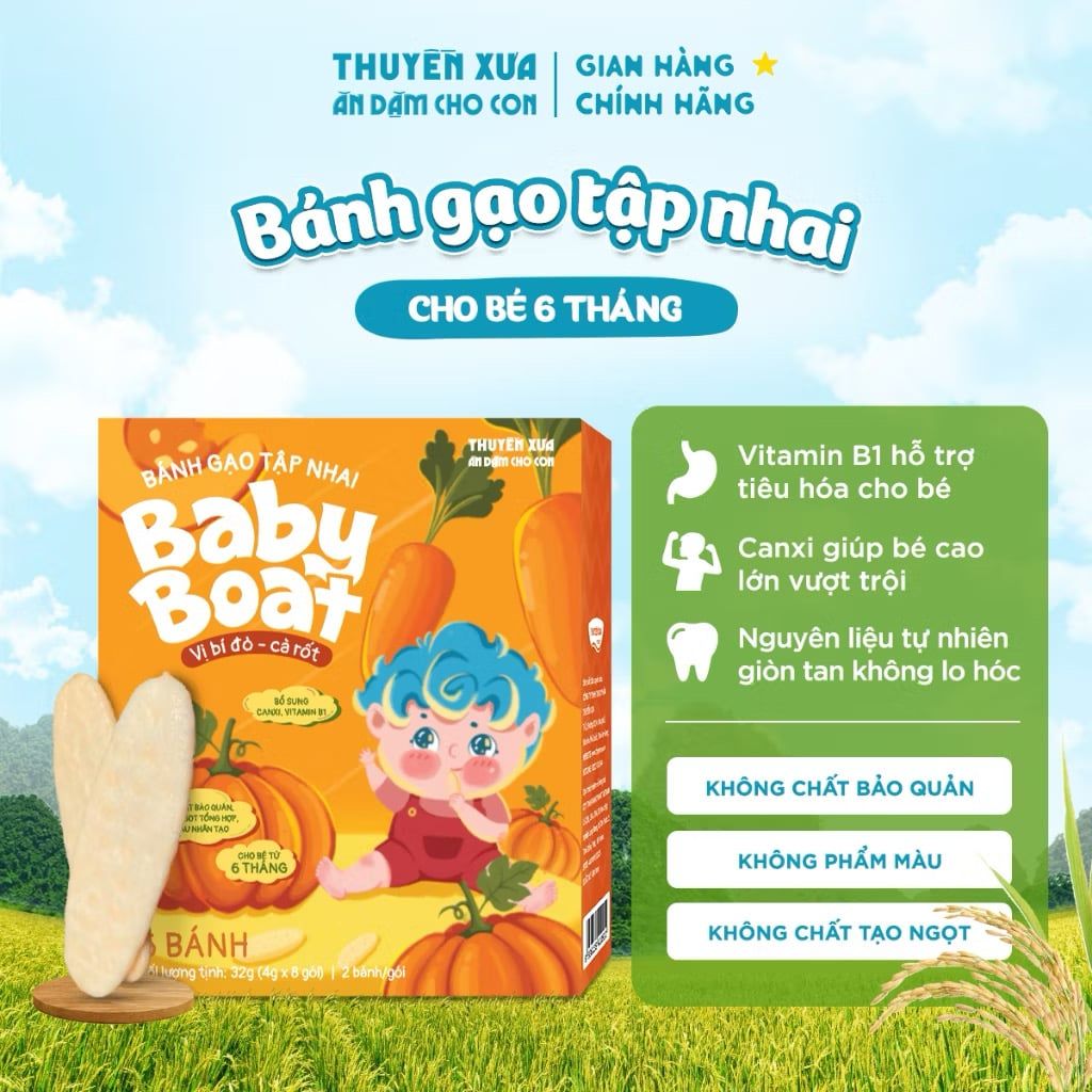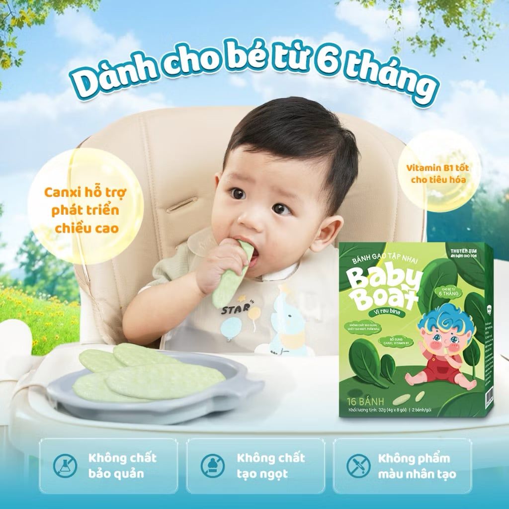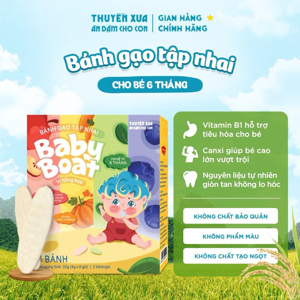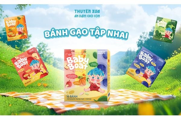 Một trong những sản phẩm được nhiều mẹ tin tưởng lựa chọn hiện nay là bánh gạo ăn dặm tập nhai Baby Boat của Thuyền Xưa. Với thành phần lành tính, kết cấu bánh tan nhanh và hương vị tự nhiên, sản phẩm giúp bé có những bữa phụ ngon miệng đồng thời hỗ trợ rèn luyện kỹ năng nhai trong giai đoạn đầu đời.