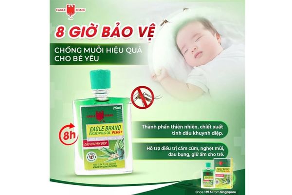 Dầu Khuynh Diệp Con Ó Eagle Brand Eucalyptus Oil Plus+ có khả năng đuổi muỗi lên đơn 8 giờ.