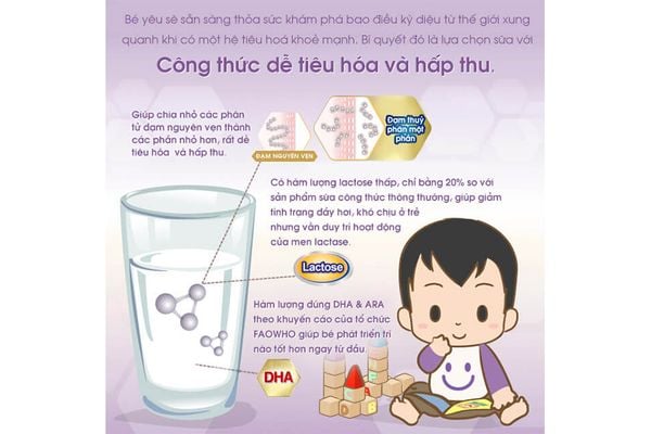 Đặc biệt, công thức đạm thủy phân một phần giúp chia nhỏ các phân tử đạm lớn thành các phân tử nhỏ hơn, tối ưu hóa khả năng tiêu hóa và hấp thụ. Ngoài ra, sản phẩm có hàm lượng Lactose thấp (chỉ bằng 20% so với các loại sữa công thức thông thường), giúp giảm tình trạng đầy hơi và khó chịu ở trẻ nhưng vẫn đảm bảo duy trì hoạt động cần thiết của men Lactase.