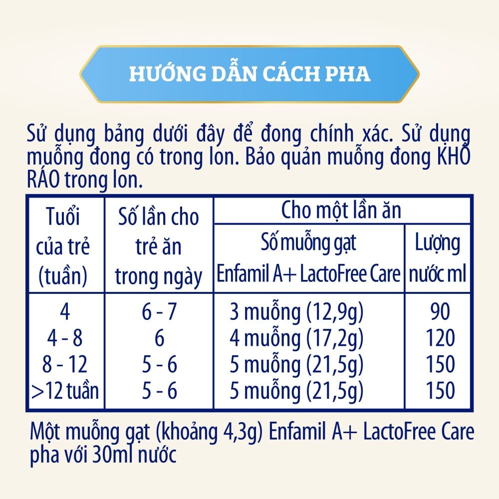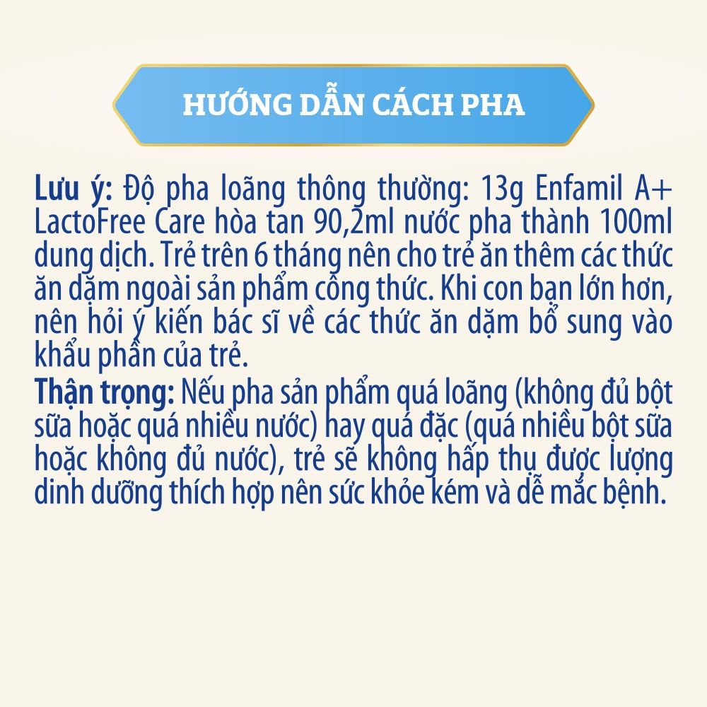 Lưu ý: Độ pha loãng thông thường: 13g Enfamil A+ Lactofree Care hòa tan 90,2ml nước pha thành 100ml dung dịch.