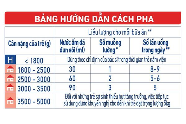 Bước 4: Tham khảo bảng hướng dẫn cách pha. Đầu tiên, đổ nước ấm vào cốc. Sau đó, thêm chính xác số muỗng lường đã gạt ngang tương ứng với cân nặng của trẻ.