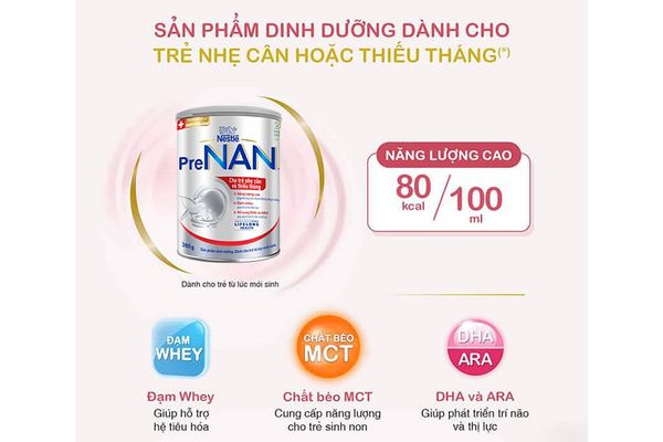 Sữa bột công thức Pre Nan Nestle 380g (0M+) cho trẻ nhẹ cân, thiếu tháng với hàm lượng năng lượng 80,8 kcal trong mỗi 100ml sữa pha, được bổ sung từ bột đạm whey và sữa tách kem. Do đó, Sữa bột công thức Pre Nan Nestle 380g (0M+) hỗ trợ trẻ biếng ăn, hấp thu kém, đặc biệt là trẻ sinh non hoặc nhẹ cân nhanh chóng phục hồi thể lực và cải thiện cân nặng hiệu quả.