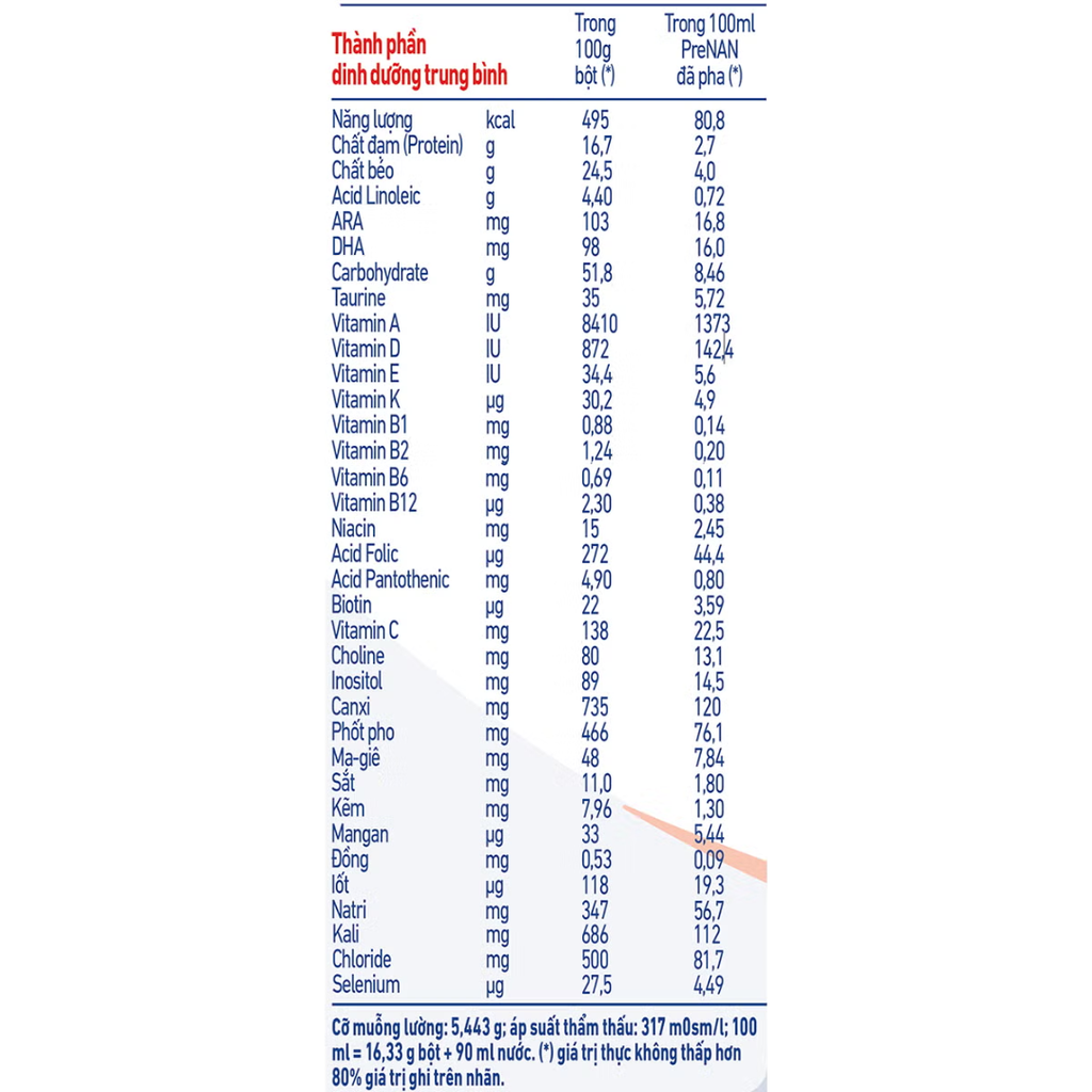 Ngoài ra, Sữa bột công thức Pre Nan Nestle 380g (0M+) còn chứa vitamin A, D, E, K, B1 và các khoáng chất như canxi, kali, magie... giúp phát triển hệ xương chắc khỏe, nâng cao sức đề kháng và hoàn thiện thể chất toàn diện.